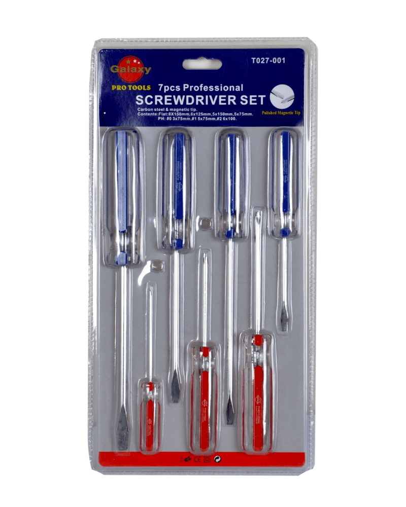 The Galaxy T027-001 7 PCS Screwdriver Set includes durable flat and Phillips screwdrivers designed for precision, comfort, and long-lasting performance in professional and home applications.
